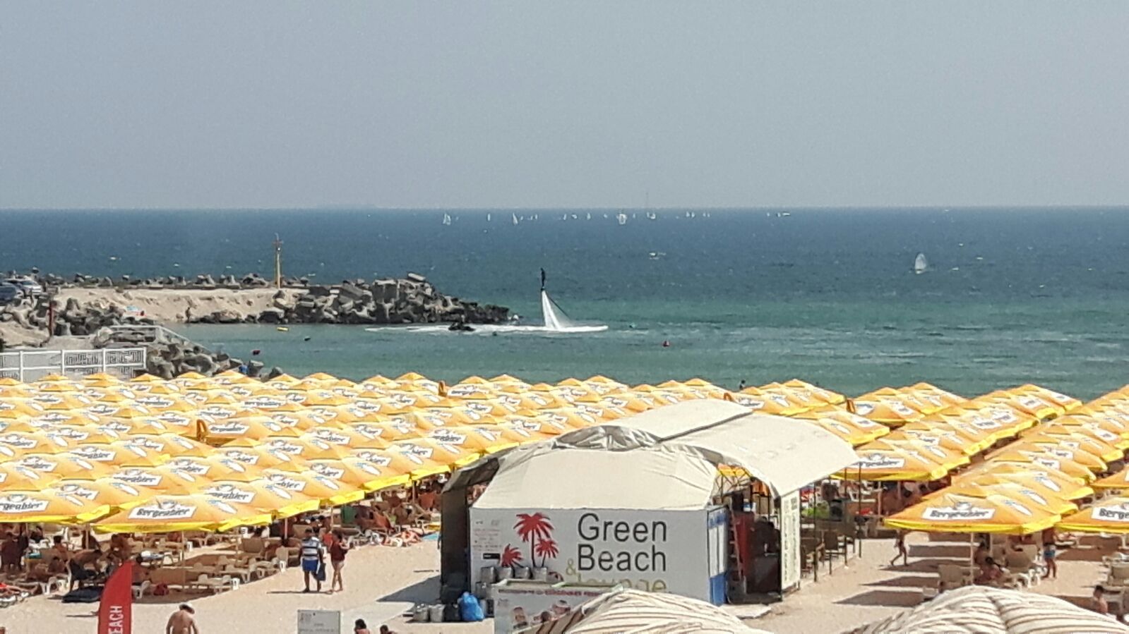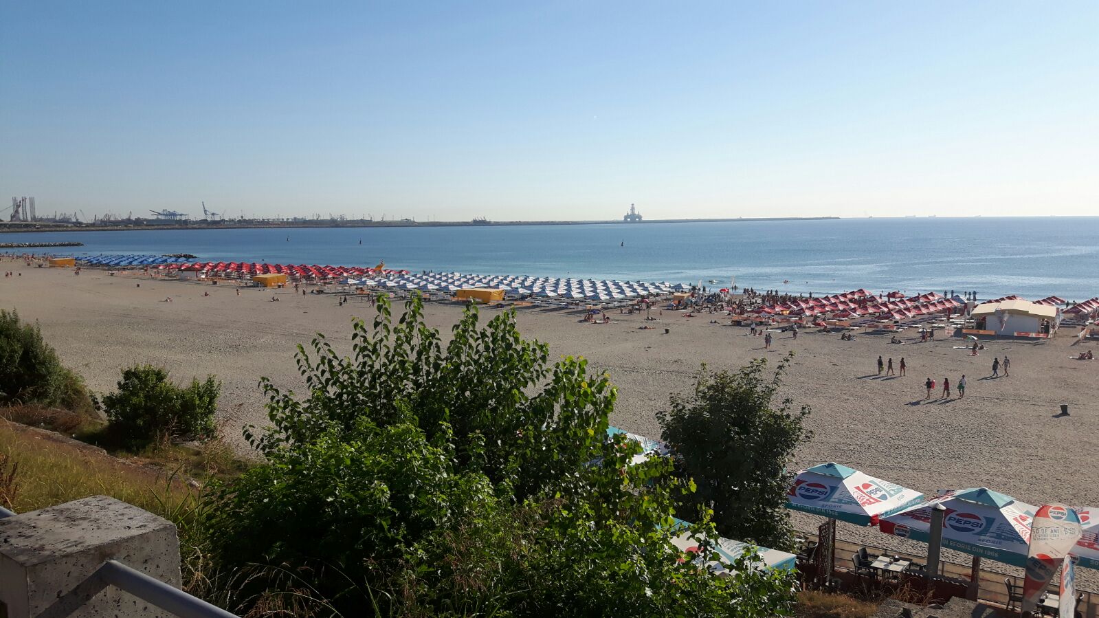 Romania! O plaja murdara, cu cateva pubele rasfirate printre sezlonguri, pline pana la refuz, cu o patura de alge si scoici ce se intndea pe o lungime de aproximativ 2-3 metri inainte de intrarea in apa, deasupra careia zburau roiuri de musculite si care degaja un miros apasator. O apa murdara si plina de alge.