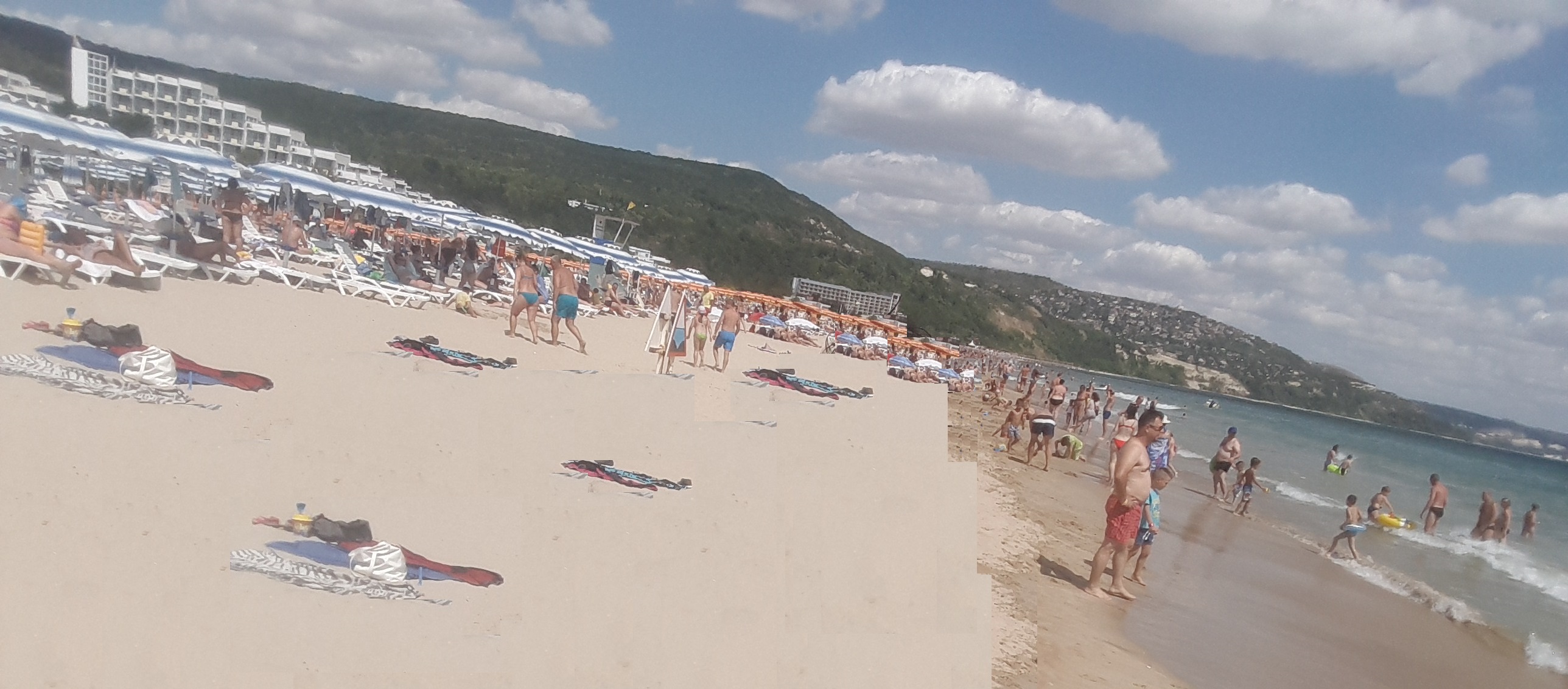 Bulgaria! Plaja a fost foarte curata cu nisip fin, lata si foarte intinsa, intrarea in apa marii facandu-se lin. Nu existau pietre sau scoici iar algele lipseau cu desavarsire atat pe plaja cat si in apa.